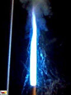 Copper (I) chloride salts imparts a blue colour to flames. The picture above shows the colour arising from adding cuprous chloride (CuCl) to a burning mixture of potassium chlorate and sucrose. This flame is relatively cool. Hotter flames burn green bacause of emission from copper atoms (only to be demonstrated by a professionally qualified chemist).